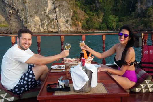 17.00 – 18.00 น. B.B.Q และอาหารไทยมื้อเย็นบนเรือและล่องเรือไปทางทิศตะวันตกของคาบสมุทรไร่เลย์