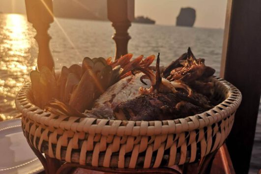 17.00 – 18.00 น. B.B.Q และอาหารไทยมื้อเย็นบนเรือและล่องเรือไปทางทิศตะวันตกของคาบสมุทรไร่เลย์