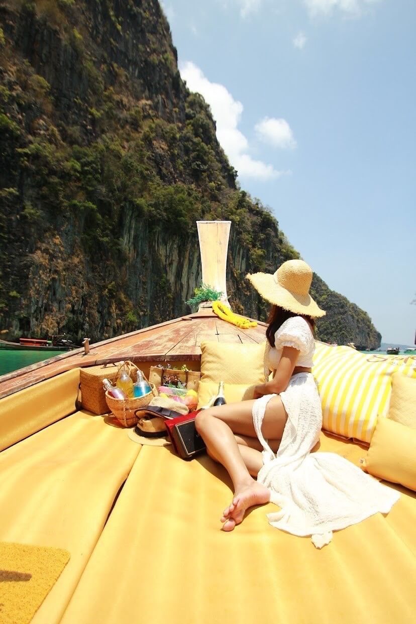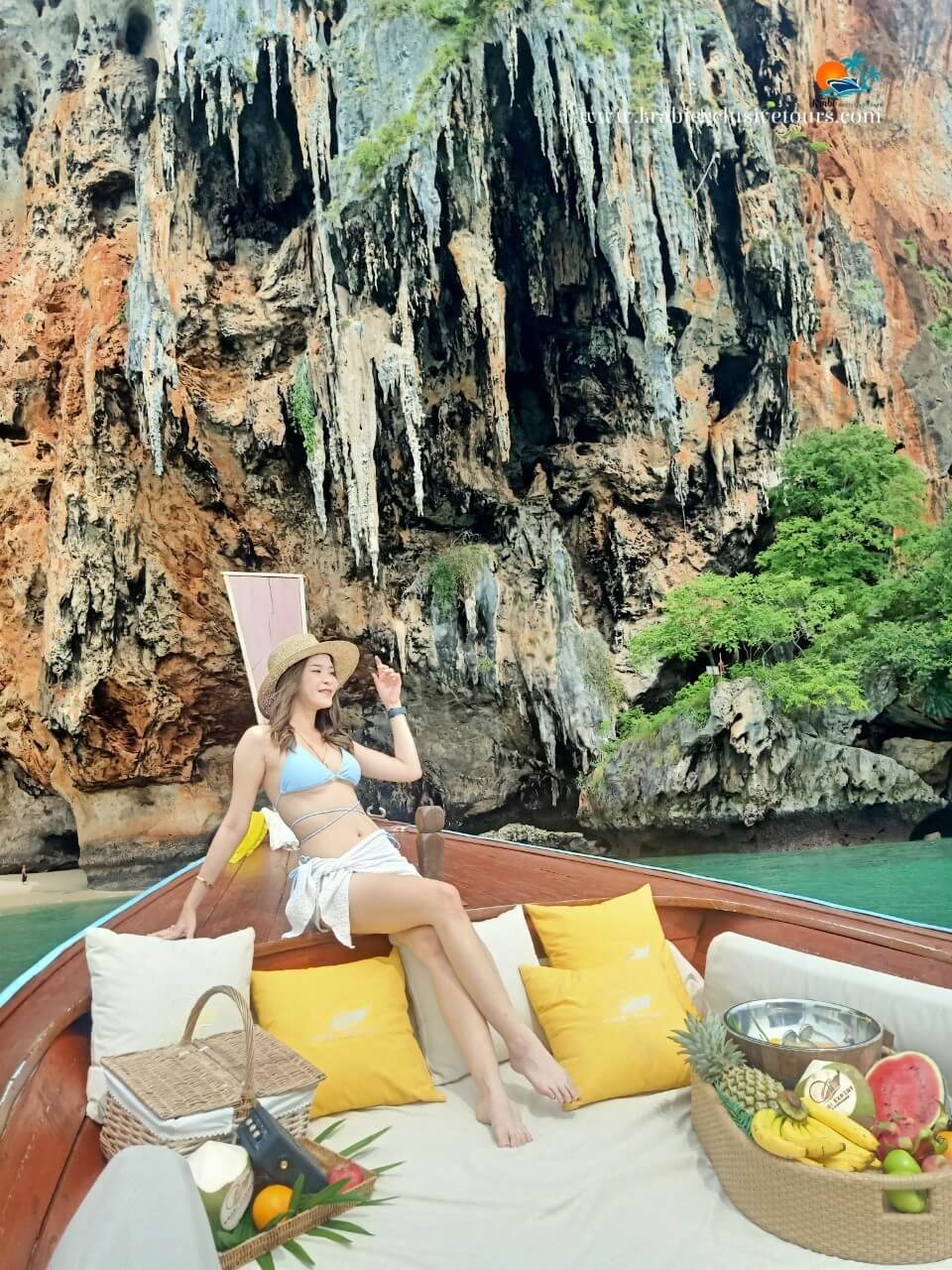 Luxury Longtail Boat Service in Krabi: If you enjoy taking photos and posting them on Instagram and other social media, we highly recommend a unique and unmissable option for your Krabi trip. Our luxury longtail boats feature wooden roofs and VIP interiors with a classic, vintage design. The bow is elegantly decorated with fruit baskets and speakers, and the roof offers a stylish spot for photos. Luxury longtail boats are becoming increasingly popular, and we are ready to provide you with a truly worthwhile vacation.